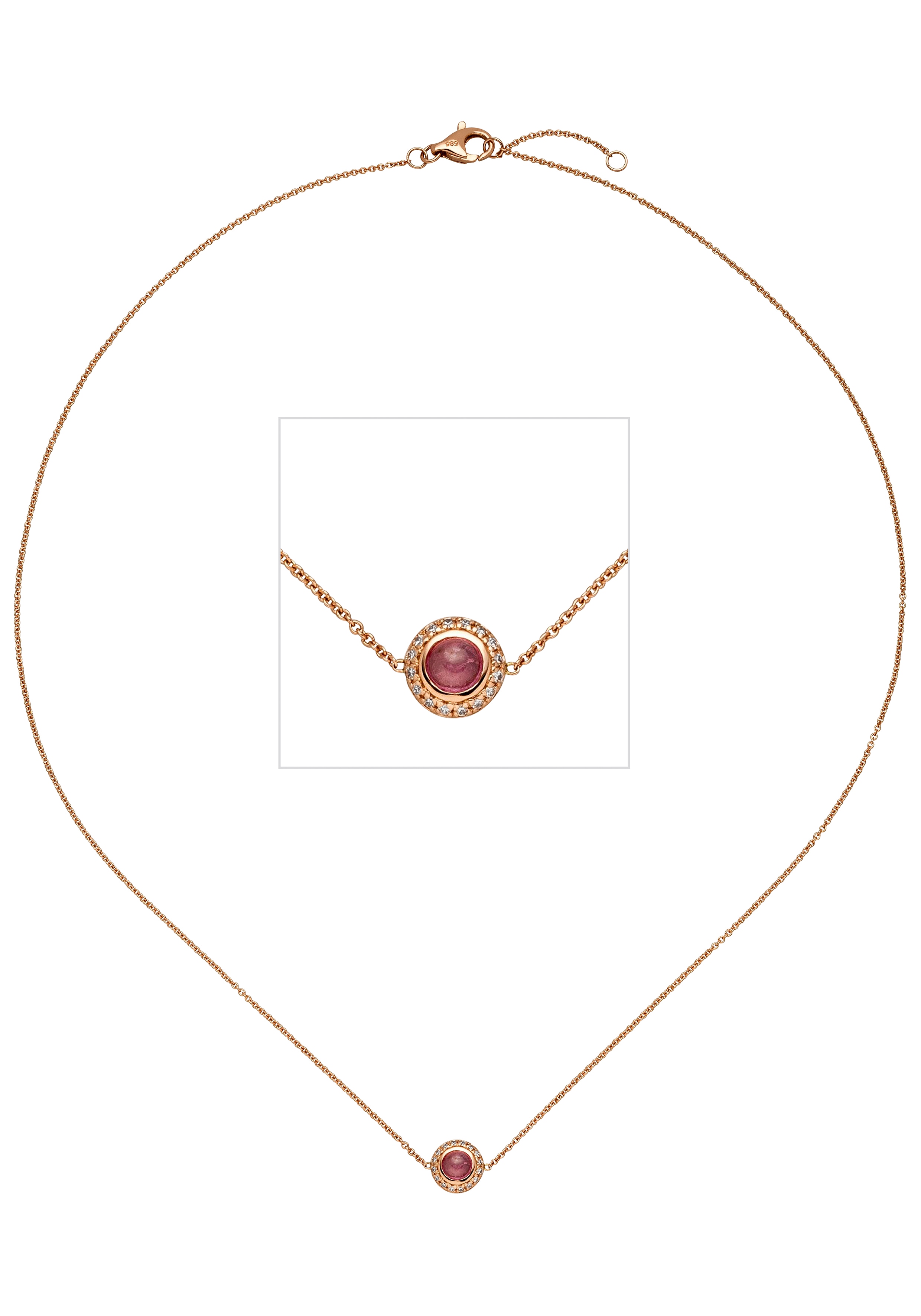 Collier / Ankerkette aus 14 Karat (585) Rotgold mit einem pinkfarbenen Turmalin-Cabochon und 16 Diam...