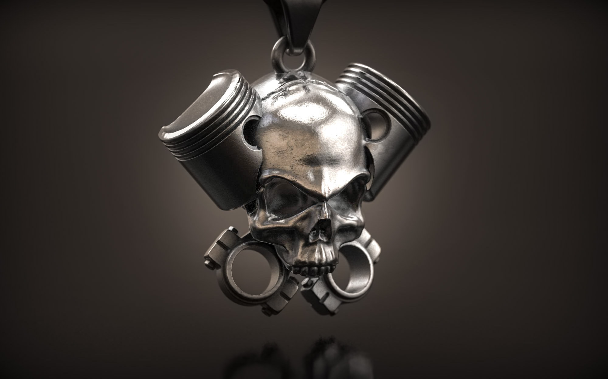 Piston and Skull Pendant, Biker Pendant, Mens Motorcyle Pendant, En...