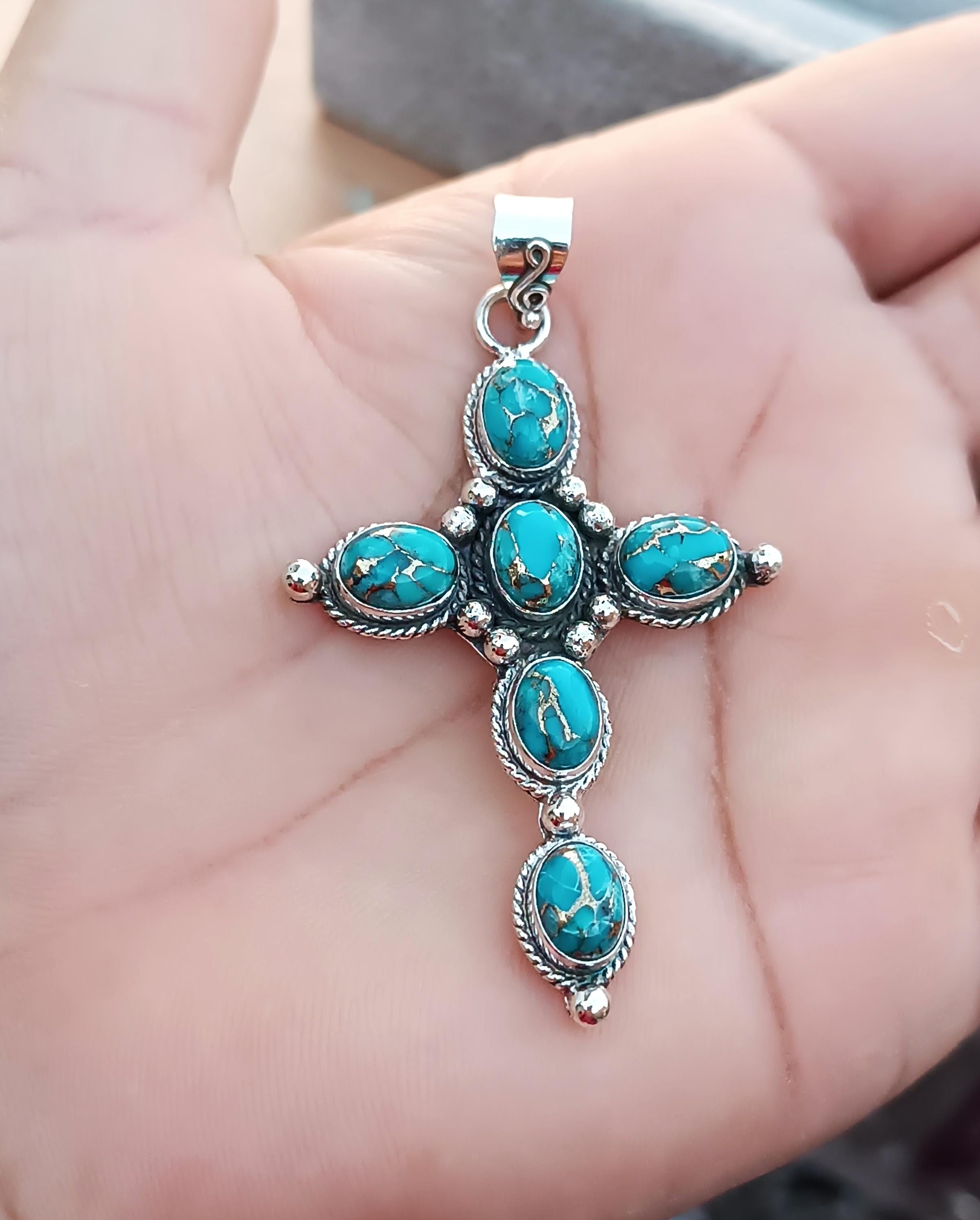Copper Turquoise Pendant 925 Sterling Pendant, Cross Pendant, Turqu...