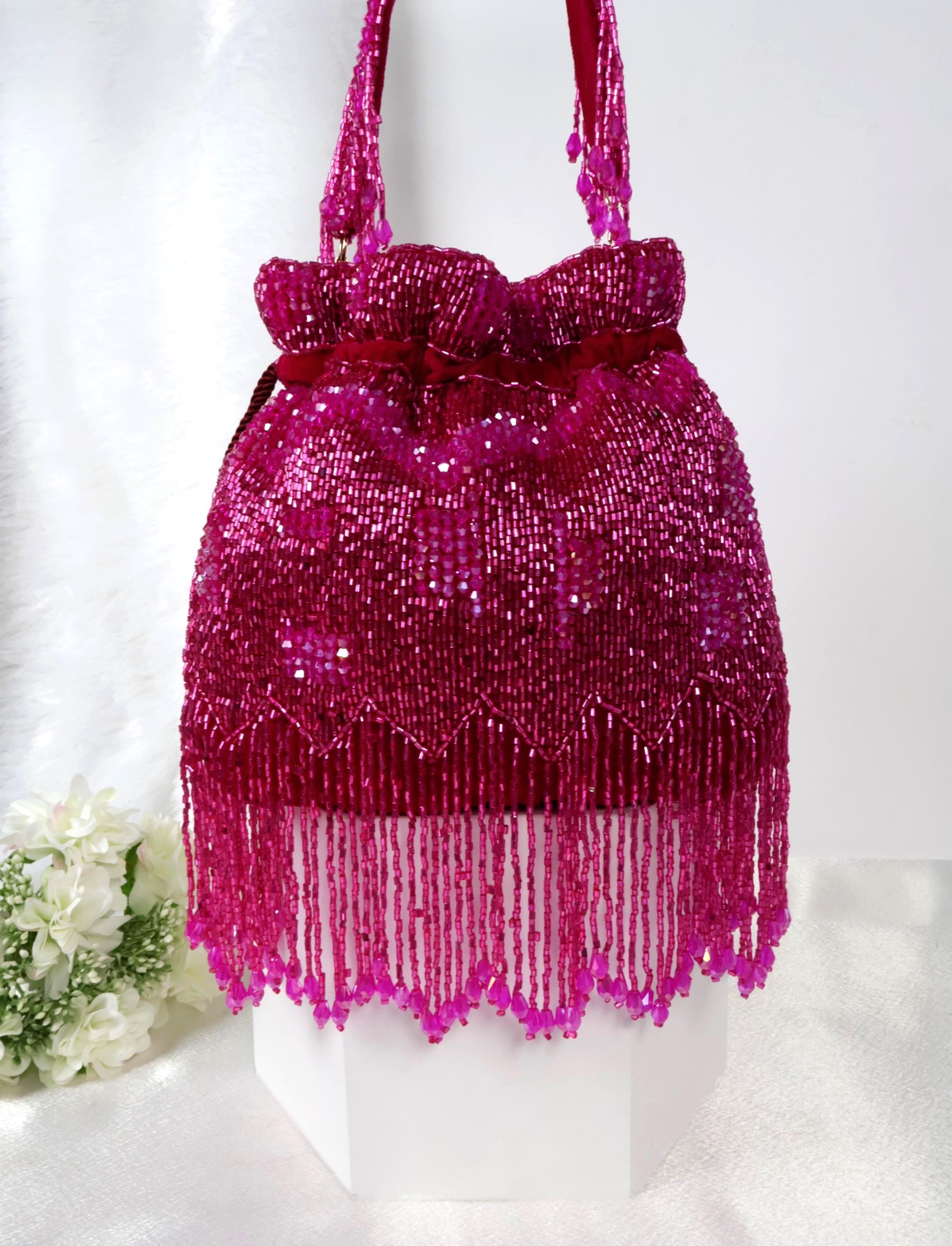 Magenta Pink Perlen Potli Tasche | Bestickte Hot Pink Kordelzug Beu...