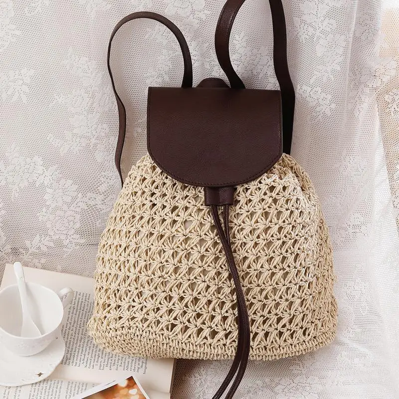 Sommer aushöhlen Rucksack Kordel zug Hasp Stroh Tasche Schult asche Stricken Rucksack Strand ta...