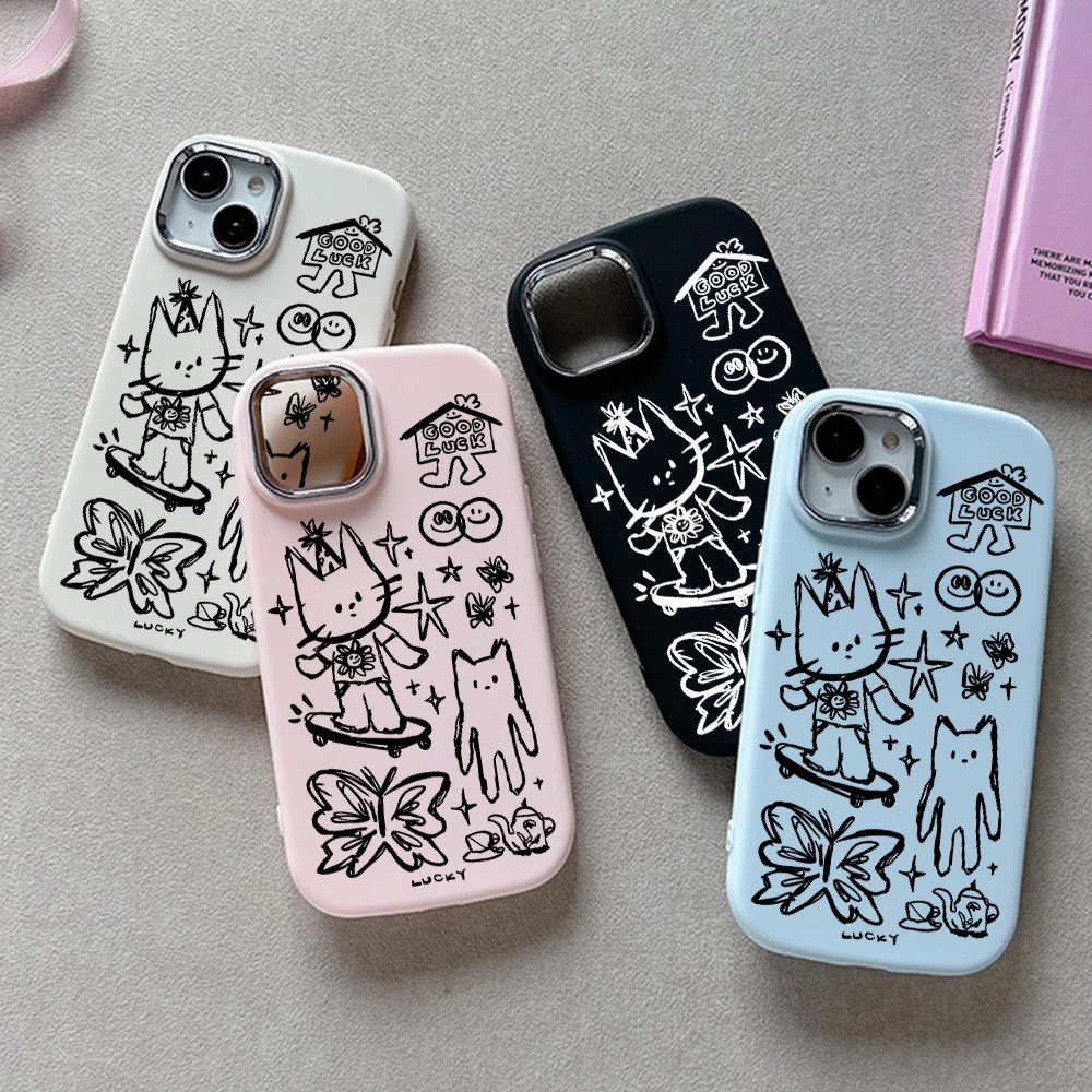 Niedliche Cartoon-Skizze, schwarze Katze, Handyhülle für iPhone 15 14 13 12 11 Pro Max X X...