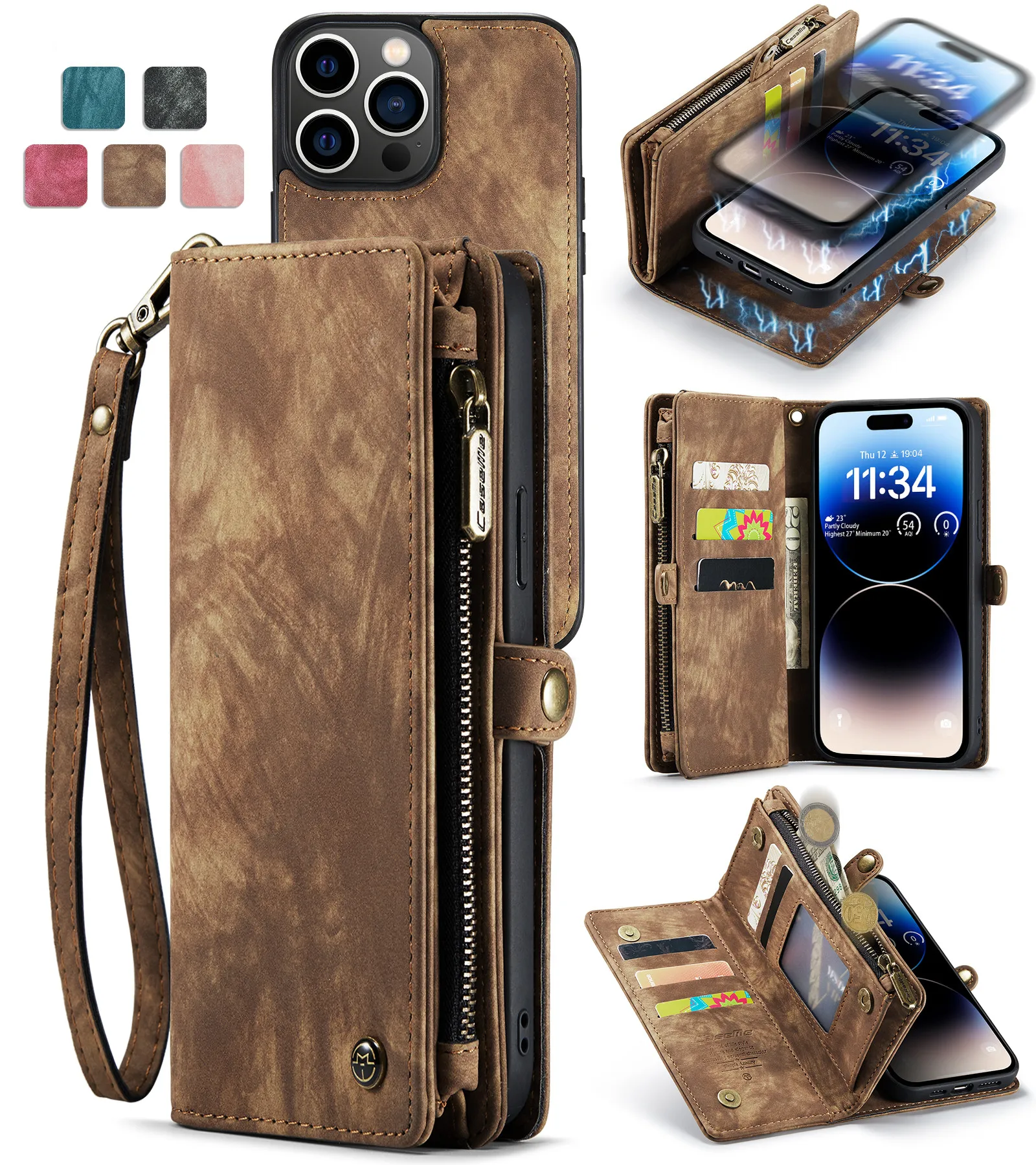 Für iPhone 14 Pro Max Brieftasche Fall mit Strap Zipper Wallet Card Slots & Abnehmbare Magn...