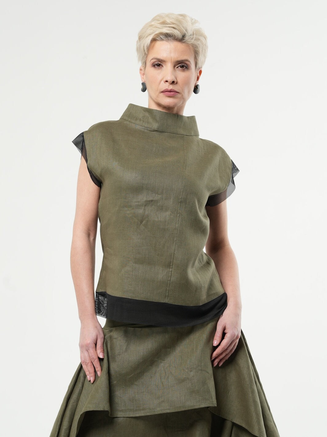 Leinen Top In Khaki / Rollkragen Leinen Bluse / Lässiges Leine...