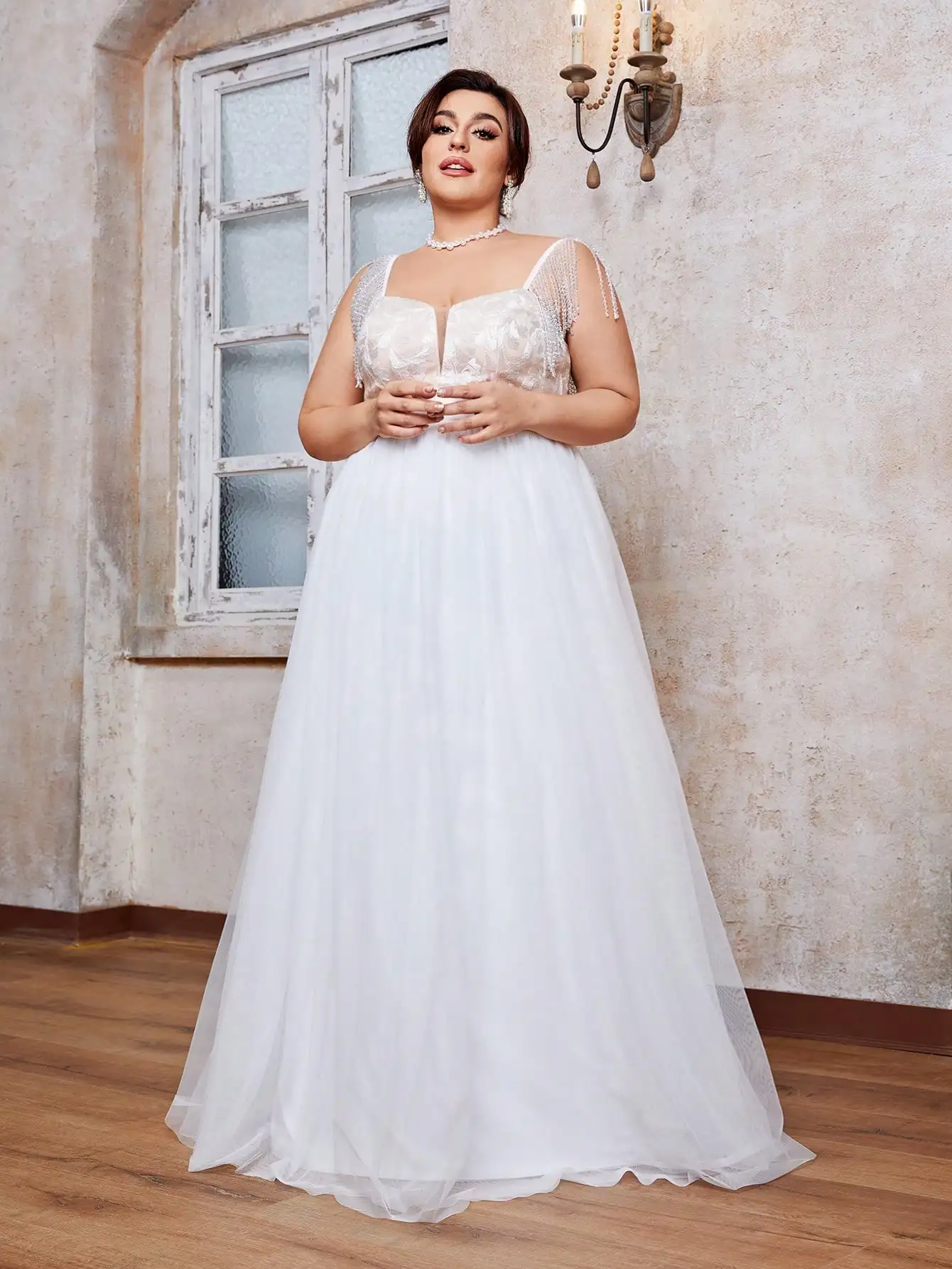 Mgiacy Plus Size Hosenträger, Rundhalsausschnitt, große Trompetenärmel, bestickte Sp...