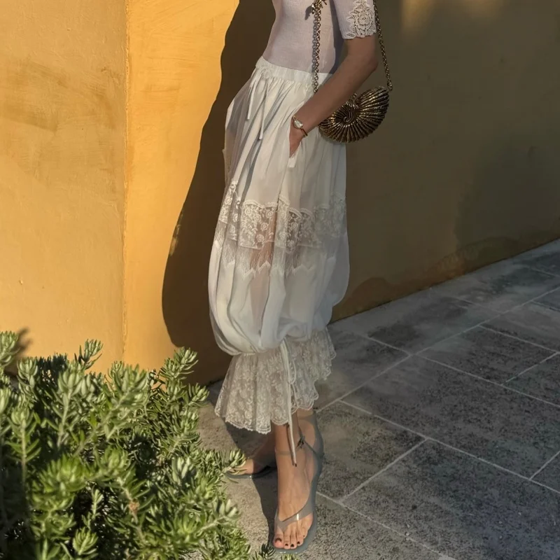 Frauen Spitze Patchwork Lose Pumphose Hosen Rüschen Hohe Taille Dame Hosen Mode Strand Lange Ba...