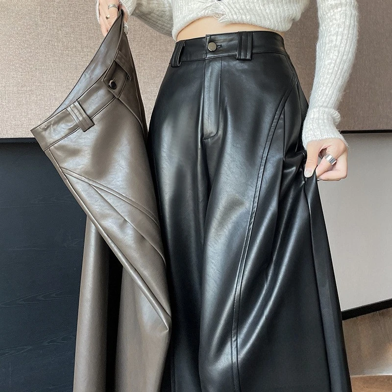 Neue Herbst Winter Hohe Taille Vintage Kaffee PU Leder Breite Bein Hosen Taste Gerade Beiläufig...