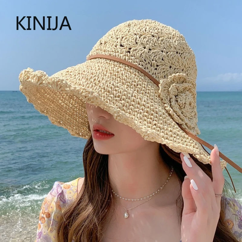 Handgefertigter Strohhut für Damen, Sommermode, Schleife, falt...