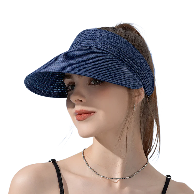 Damen-Strohhut UPF50+, breite Krempe, faltbar, Strand-Sonnenblende mit Pferdeschwanzfach, UV-Schutz