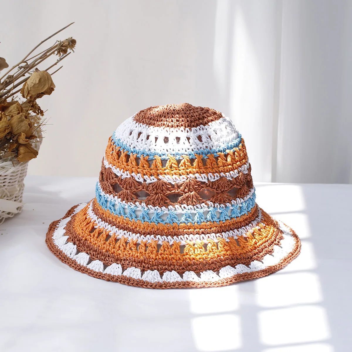 2024 Neuer Modestil-Eimerhut, mehrfarbig, faltbar, Sonnen-Häkelhut für Strand, Reisen und ...
