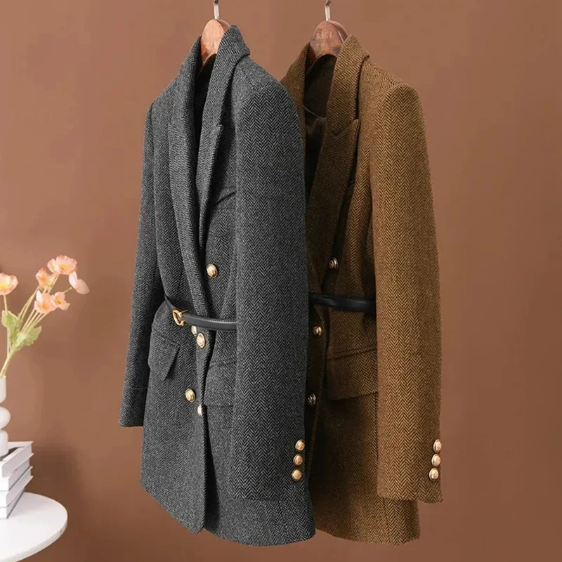 Frauen Herbst Winter Vintage Casual Fischgräten Dicken Tweed B...