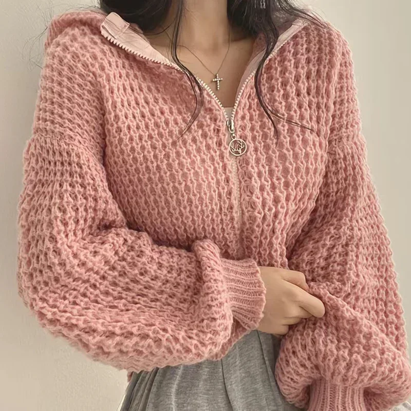 Frauen Zipper Warm Mit Kapuze Mantel Stricken Hohl Laterne Hülse Polo Kragen Mantel Lose Kausal...
