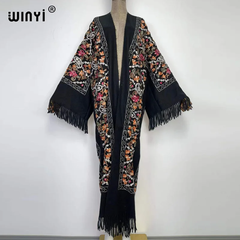 WINYI Winter Frauen quaste Pashmina Stickerei Langen Mantel Lose Revers robe femme Dicke Warme freie...