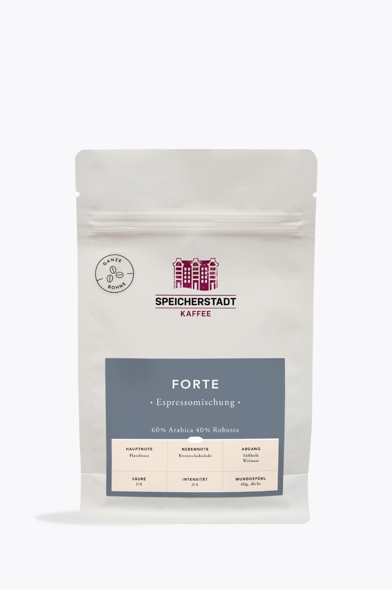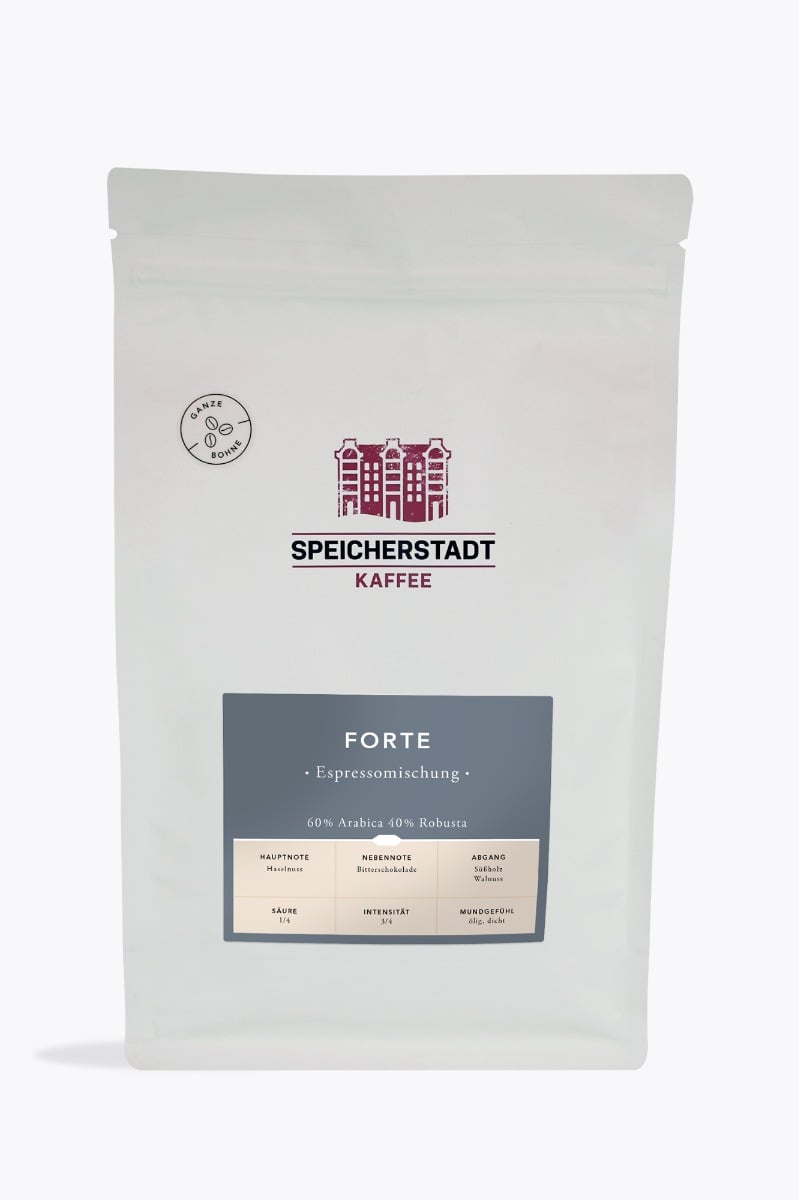 Der Espresso Forte von Speicherstadt besteht zu 60% aus milden Arabica- und zu 40% aus kräftige...
