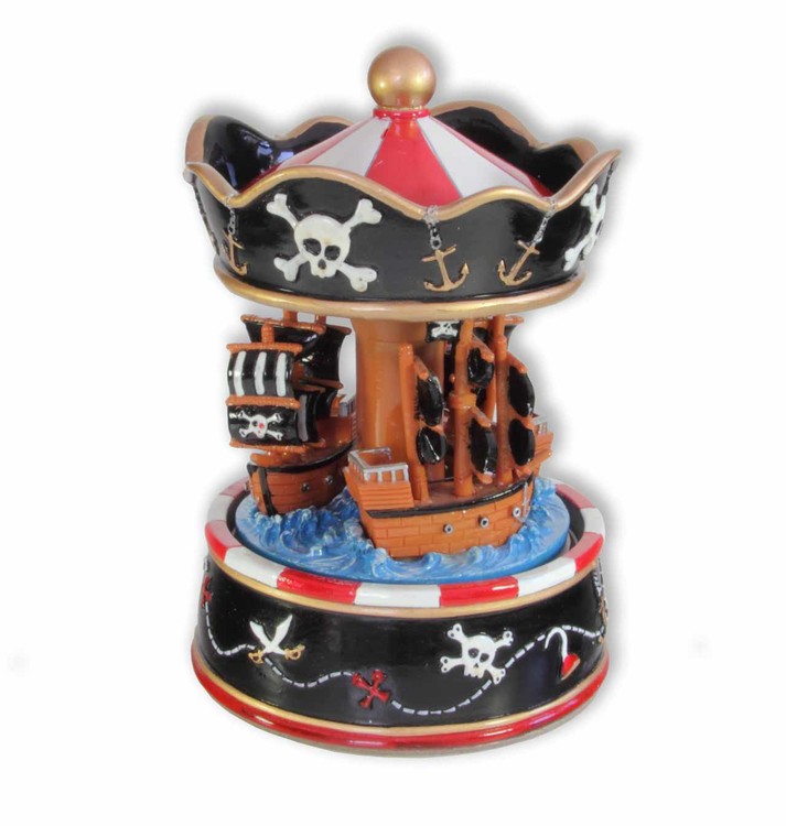 Das Karussell ist ringsum mit Piratenmotiven verziert. Der Sockel ist schwarz und hat unten einen ro...