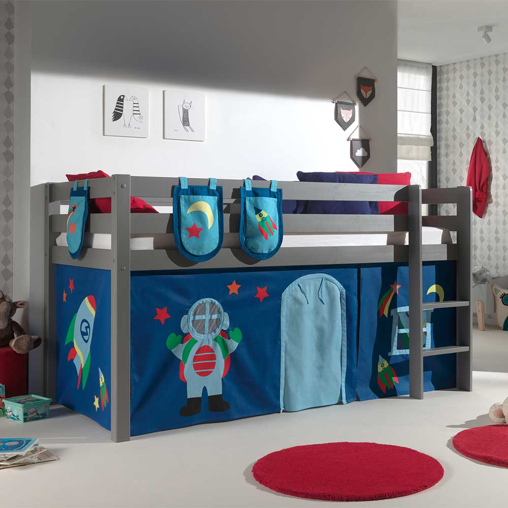 Hochbettgestell in Grau und Blau Kiefer Massivholz