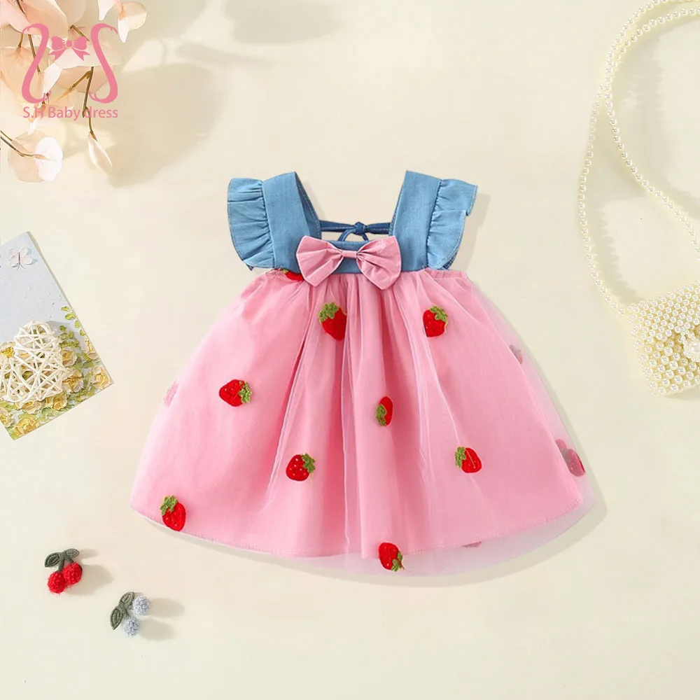 Einfache Kinderkleider, Sommer, ärmellos, Schleife, Kirsche, Stickerei, Netzstoff, Baby-Kleidun...