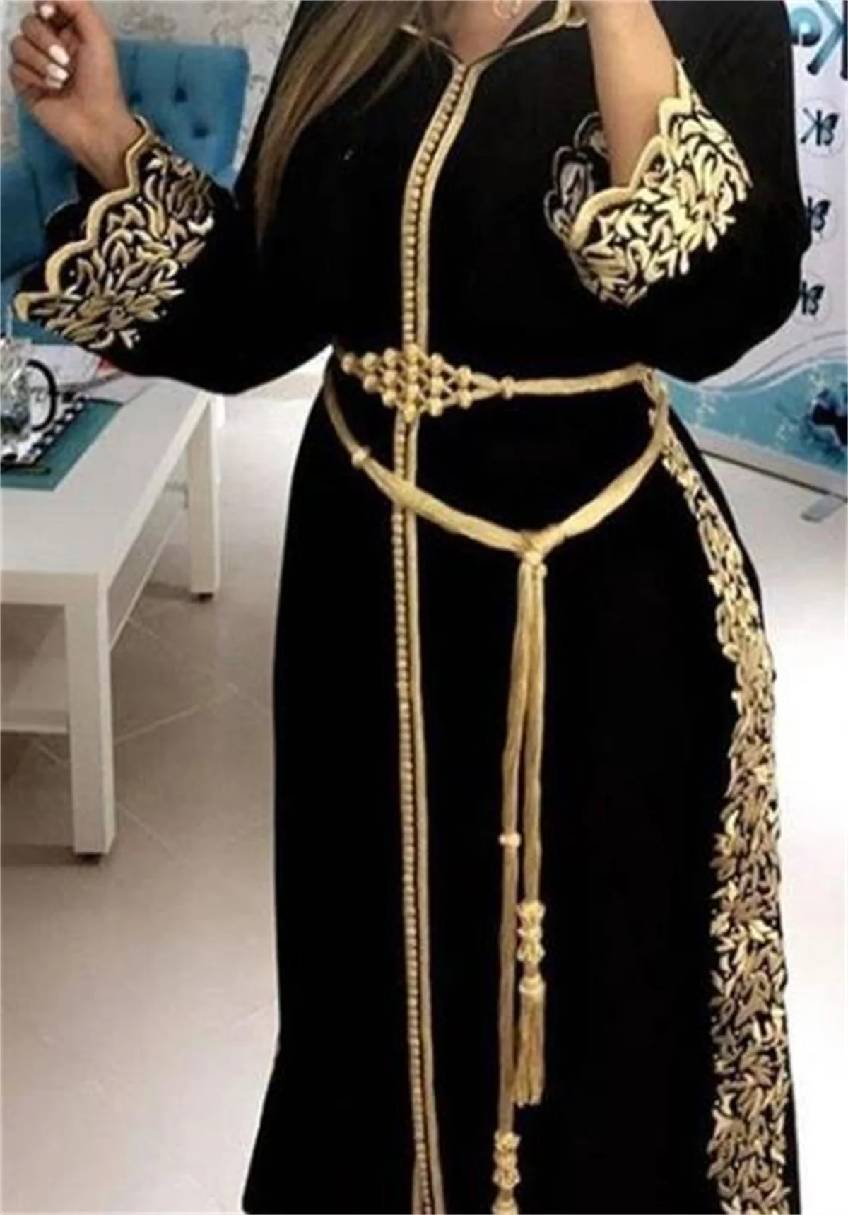 Maßgeschneidertes arabisches Kleid mit V-Ausschnitt und langen Ärmeln, Goldapplikation, s...