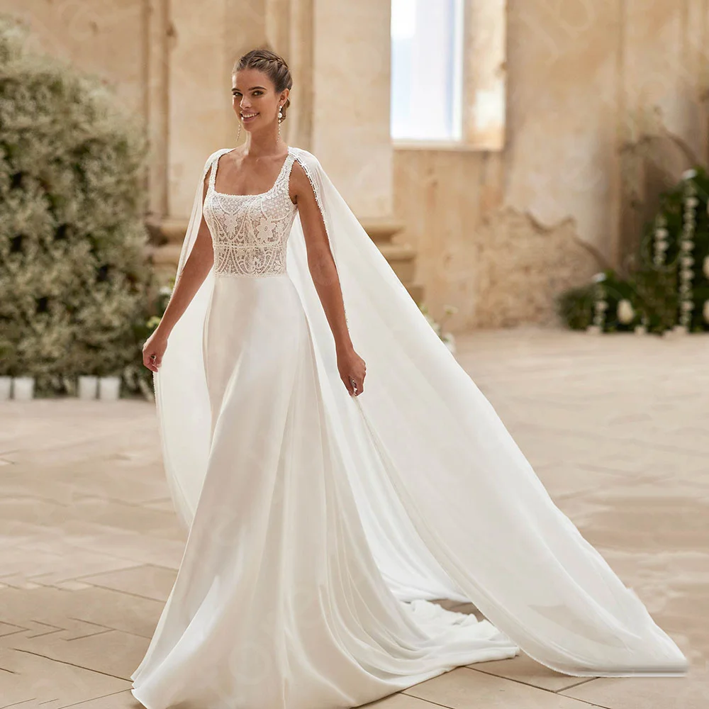 Maßgeschneiderte klassische Brautkleider 2025, weiße Brautkleider, Spitze mit Umhang, Br...