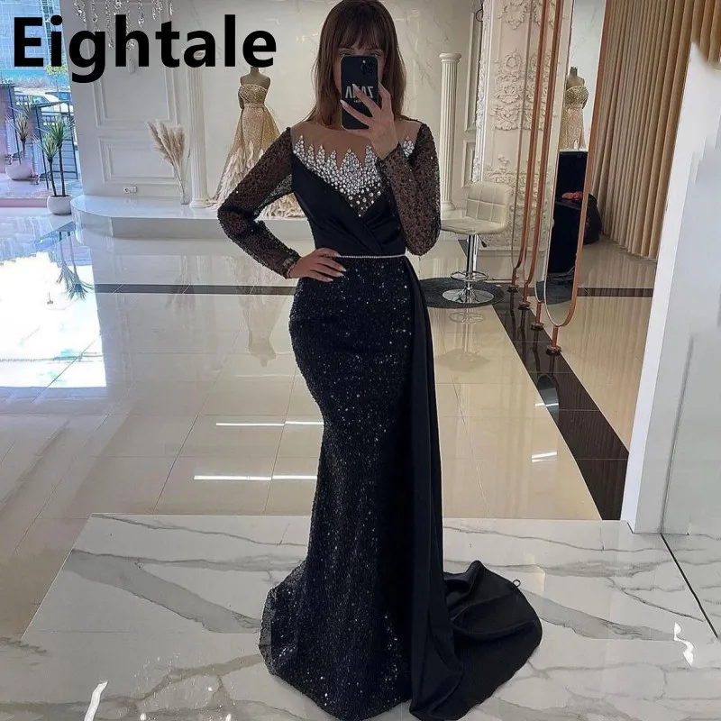 Customized Black Shinning Sequins Mermaid Long Sleeve Prom Dress Beaded Evening Dress Women Formal P...