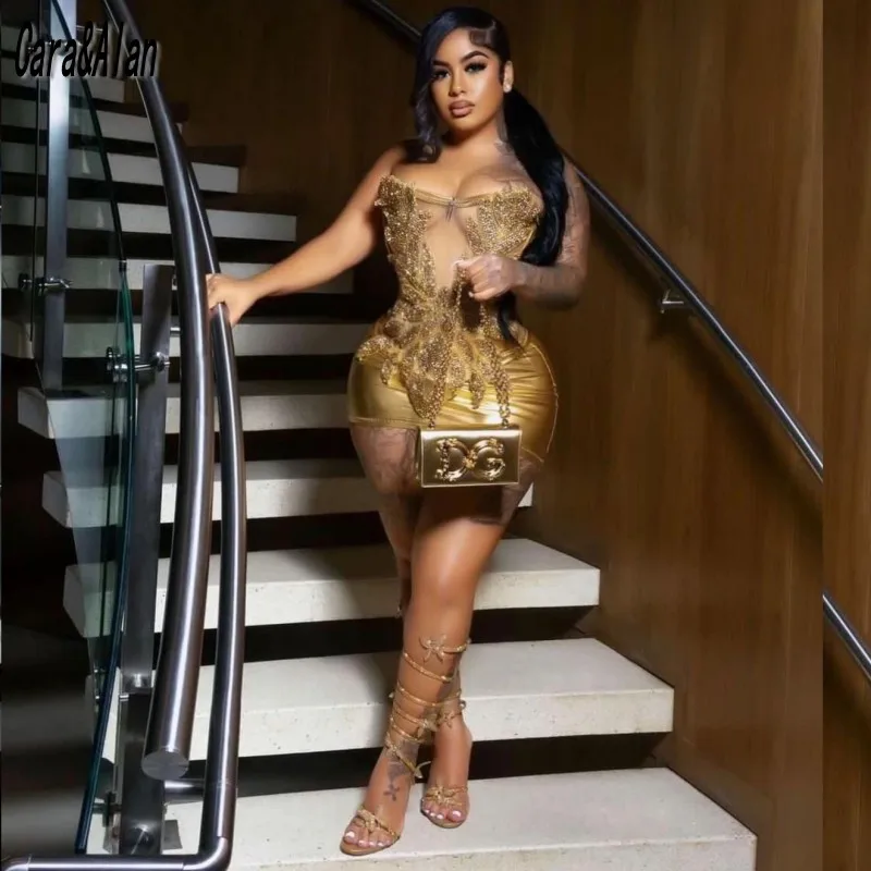 Gold Birthday Dresses Strapless Beading Mini Prom Dress 2025 Backless Clubbing Dress Nightclub Cockt...