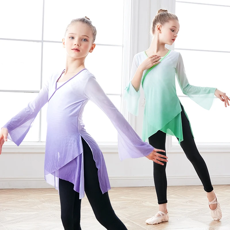 Mädchen klassische Tanz oberteile Flare Ärmel abgestufte Farbe Tanz kostüm Ballett Yo...