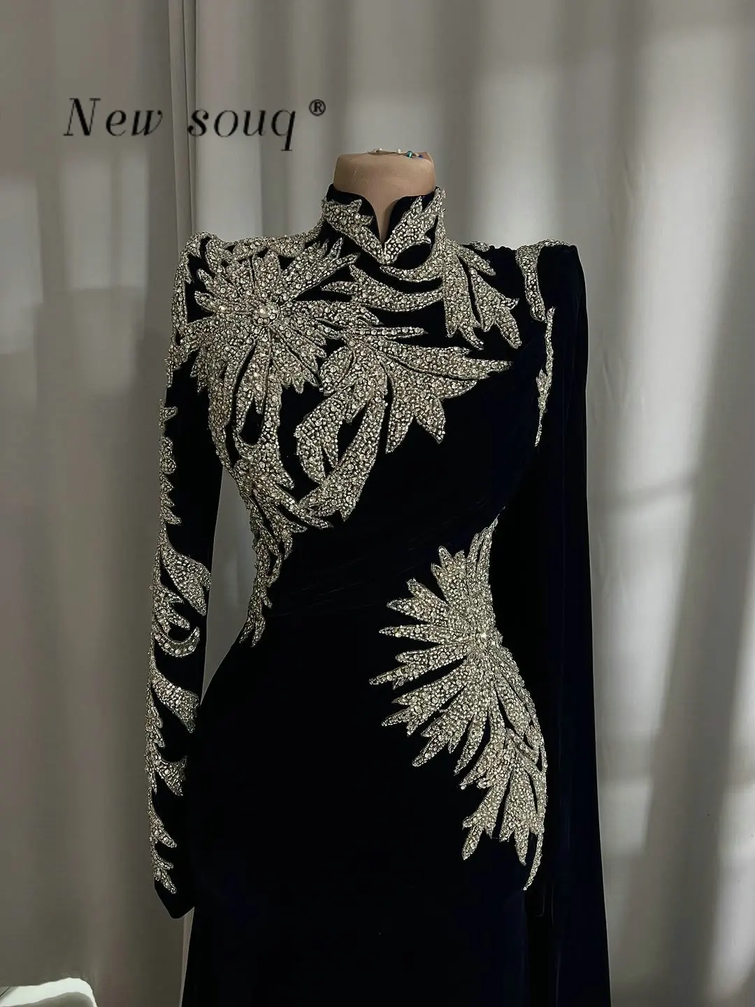 Schwarze Samt-Abendkleider aus Samt mit langen Ärmeln aus dem Nahen Osten und silbernen Perlen,...