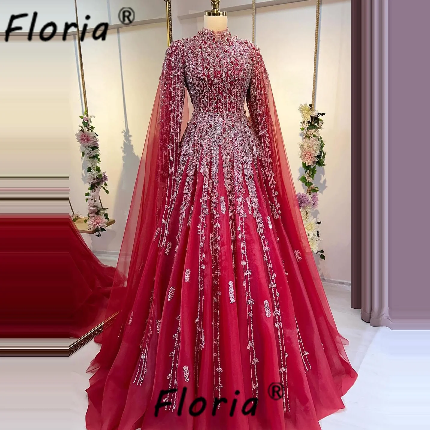 Neueste Dubai Rosa Perlen Abendkleider Stehkragen Nahen Osten Perle...