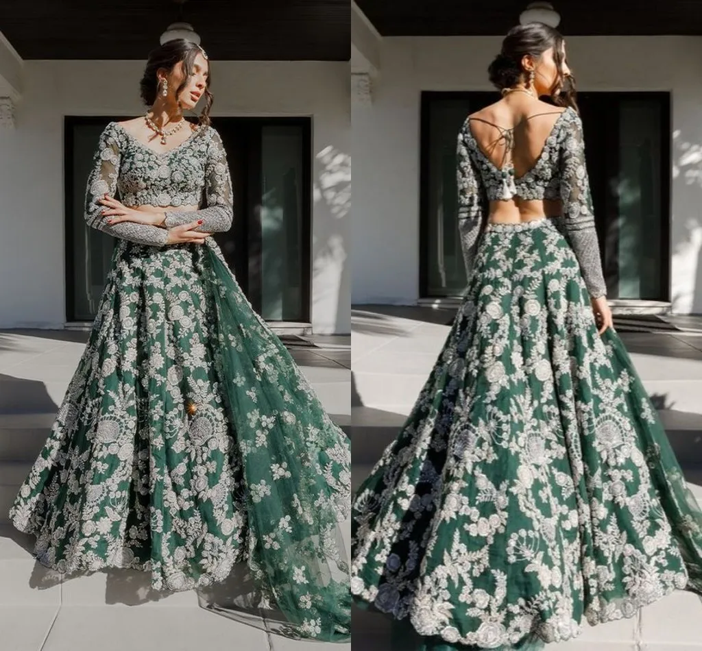 Smaragdgrüne Lehenga indische Ballkleider mit Schleier Saris zweiteilige Langarm Spitze Applika...