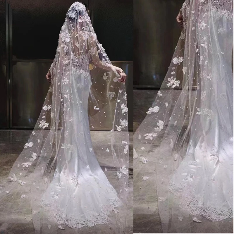Prinzessin Hochzeits schleier appliziert Perlen Blumen perlen Kathedrale Schleier ein schicht ige Ho...
