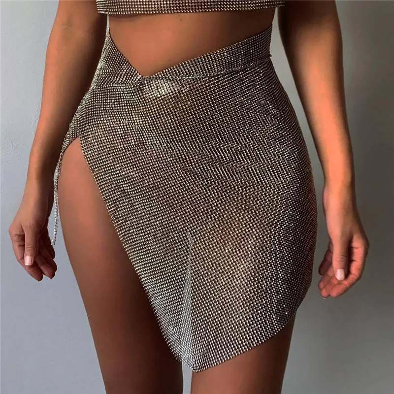 Glitzernder Strass-Metallketten-Minirock für Frauen, sexy Seitenschlitz, durchsichtiger Partyro...