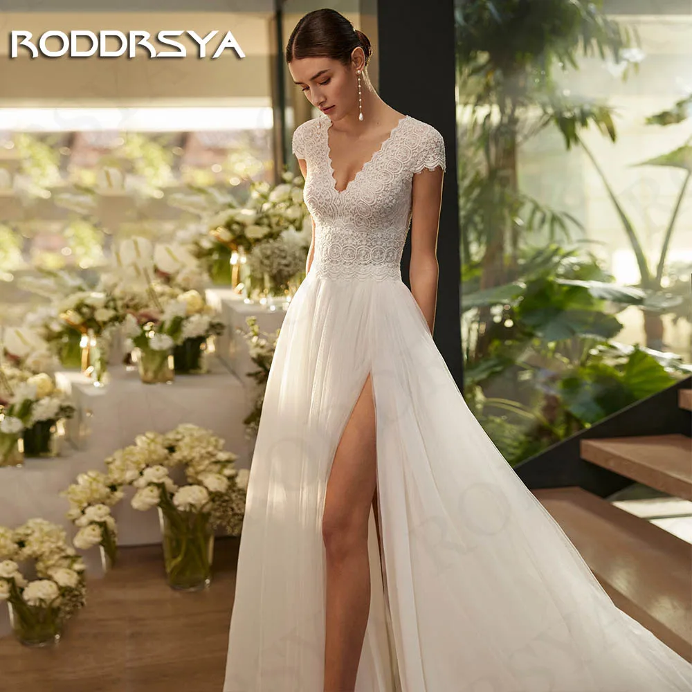 RODDRSYA Spitze Kurzen Ärmeln Hochzeit Kleid Braut Böhmischen Tüll Brautkleider V-aus...