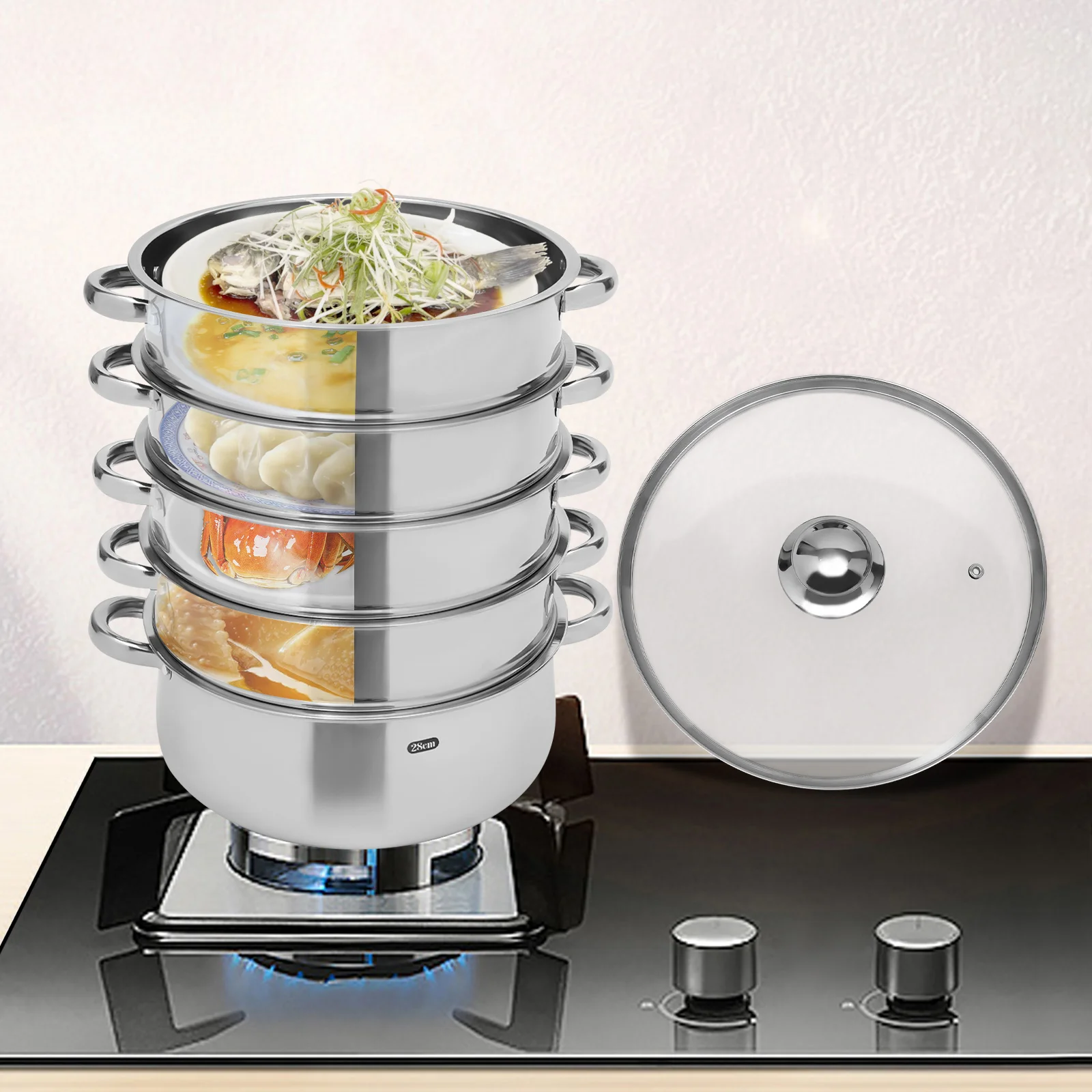 5-stöckiger Edelstahl-Dampfgarer 28cm, Dampfgartopf, Mehrstöckiges Kochgeschirr, Abnehmbar...