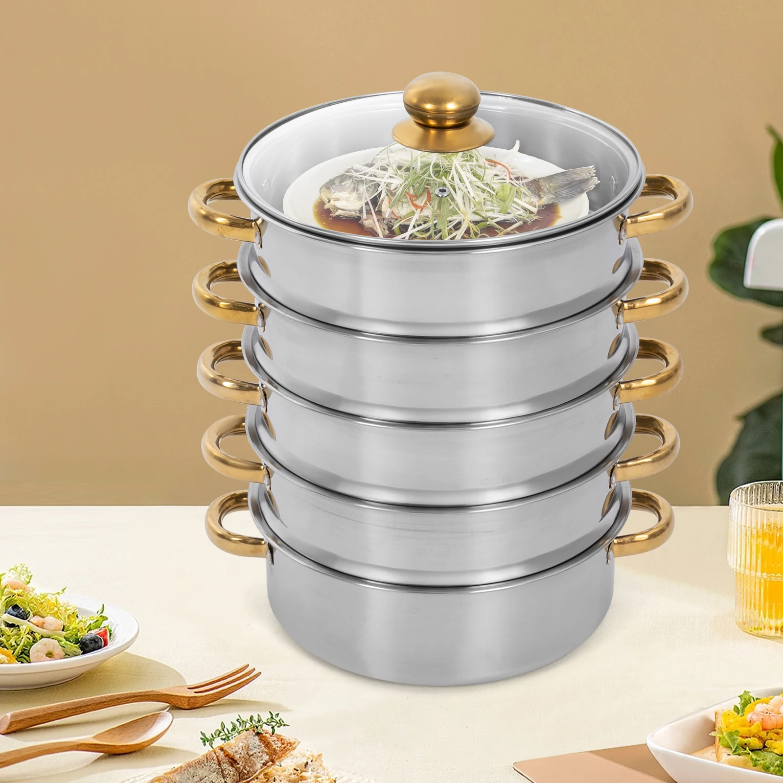 5-stufiger goldfarbener runder Dampfgarer-Kochtopf, Tisch-Dampfgare...