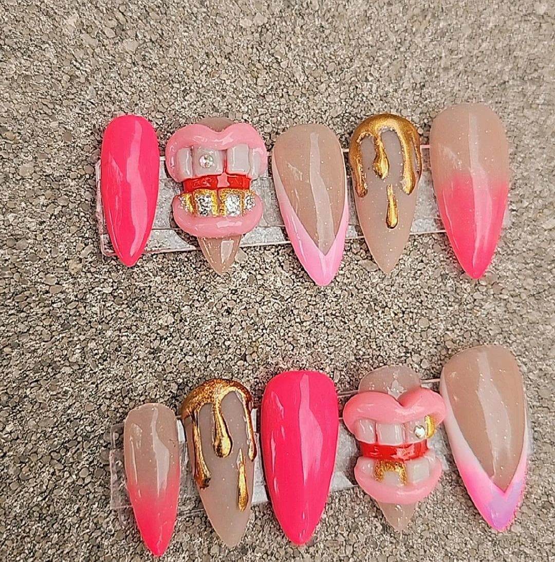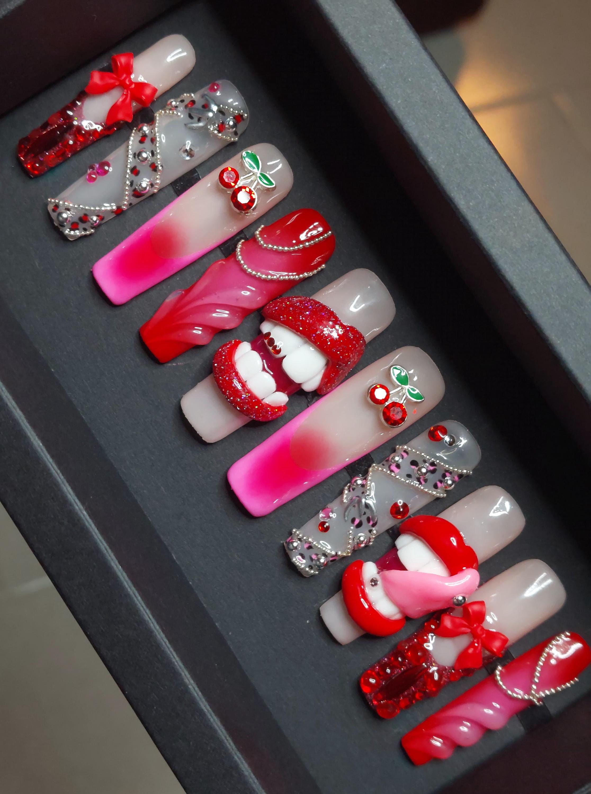 3D Lippen Press On Nails: Rot, Pink, Glitter, Kirsche