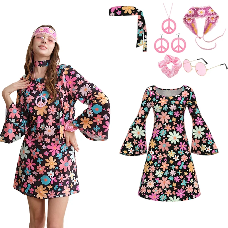 70er Jahre Disco Outfit Hippie Kostüm Damen Blume Retro Stil Kleidung Kleid Friedenszeichen Zub...