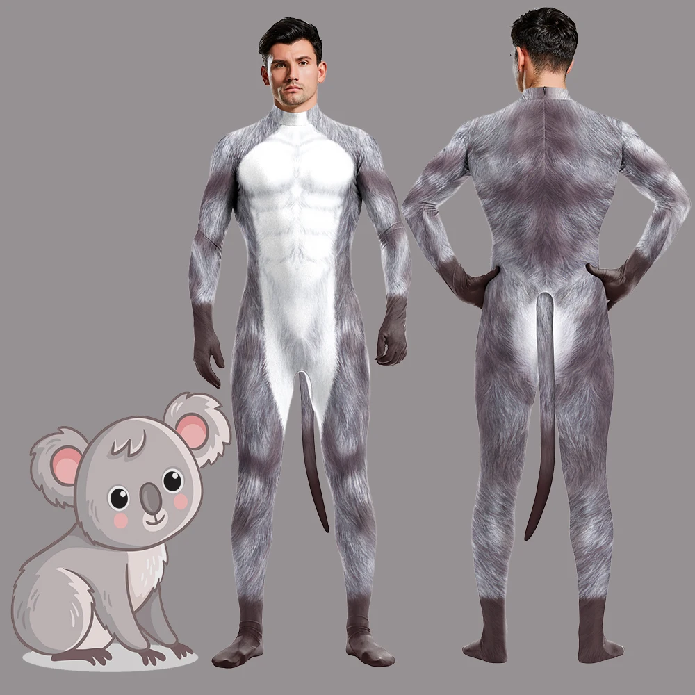 Koala Zentai mit Schwanz Tier Cosplay Kostüm Mann Karneval Party Overall 3D Druck Pelzigen Must...