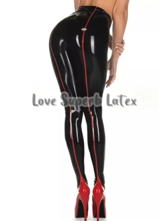 Damen-Leggings aus Naturlatex, mittelhohe Hose, modische Latex-Leggings mit roten Borten auf der R&u...