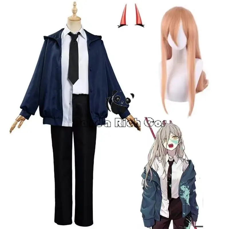 Anime Kettensäge Power Cosplay Kostüme blaue Jacke Hosen Perücke Mädchen Uniform...