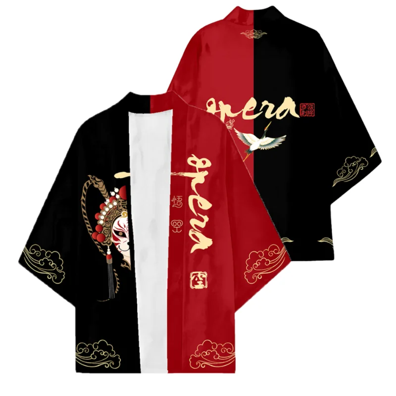 Herren-Pekin-Oper-Thema, Farbblock, japanischer Kimono-Umhang, rot, schwarz, Wolken, Maske, bedruckt...