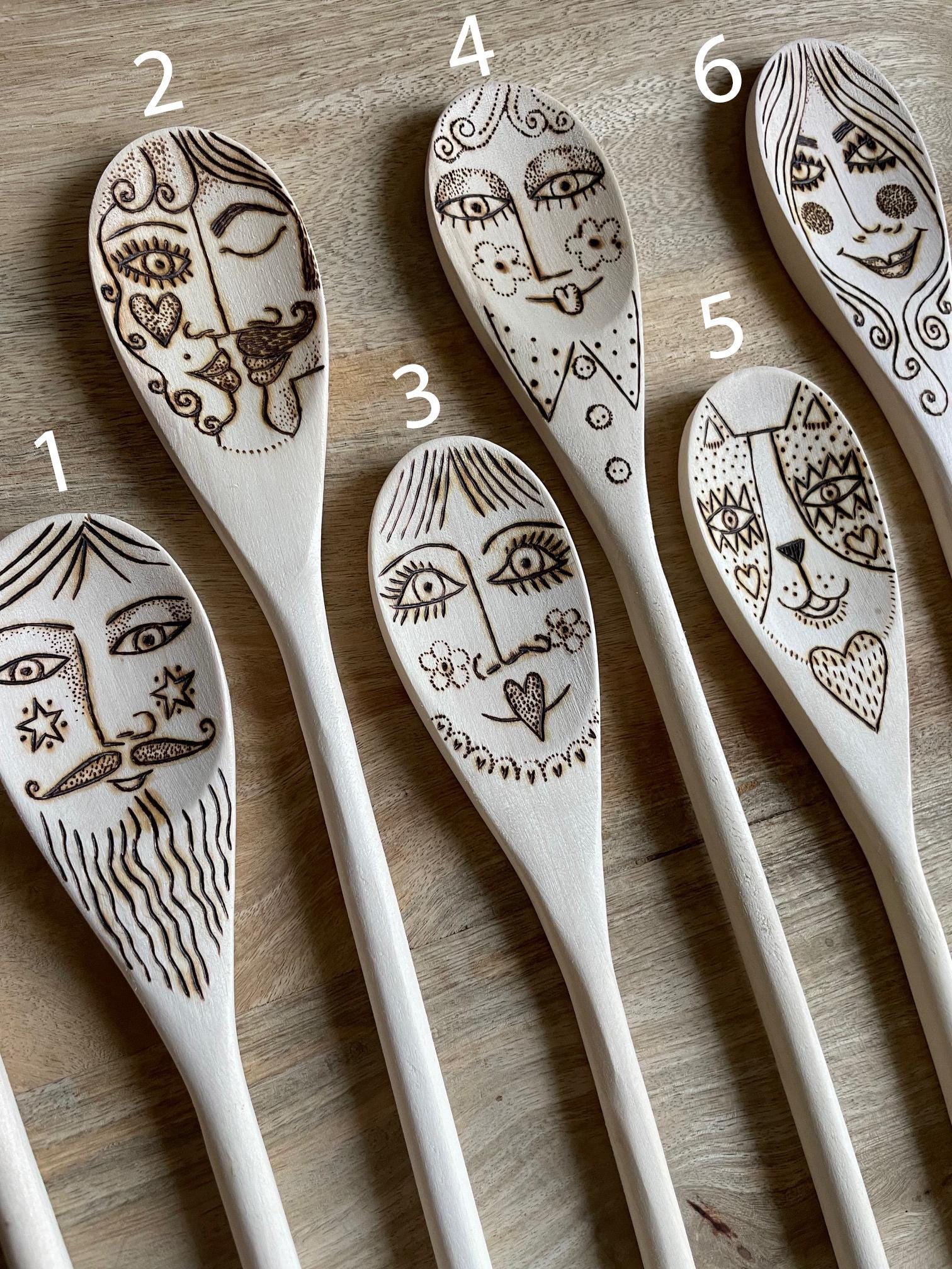 Handgezogene Holzlöffel, jedes Bild wird mit Brandmalerei ge&a...