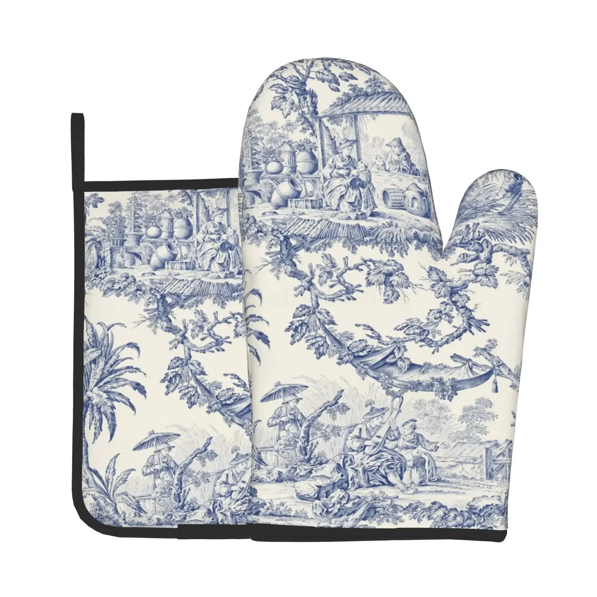 French Toile De Jouy Marineblaues Motiv, hitzebeständige Ofenhandschuhe und Topflappen-Sets, Of...