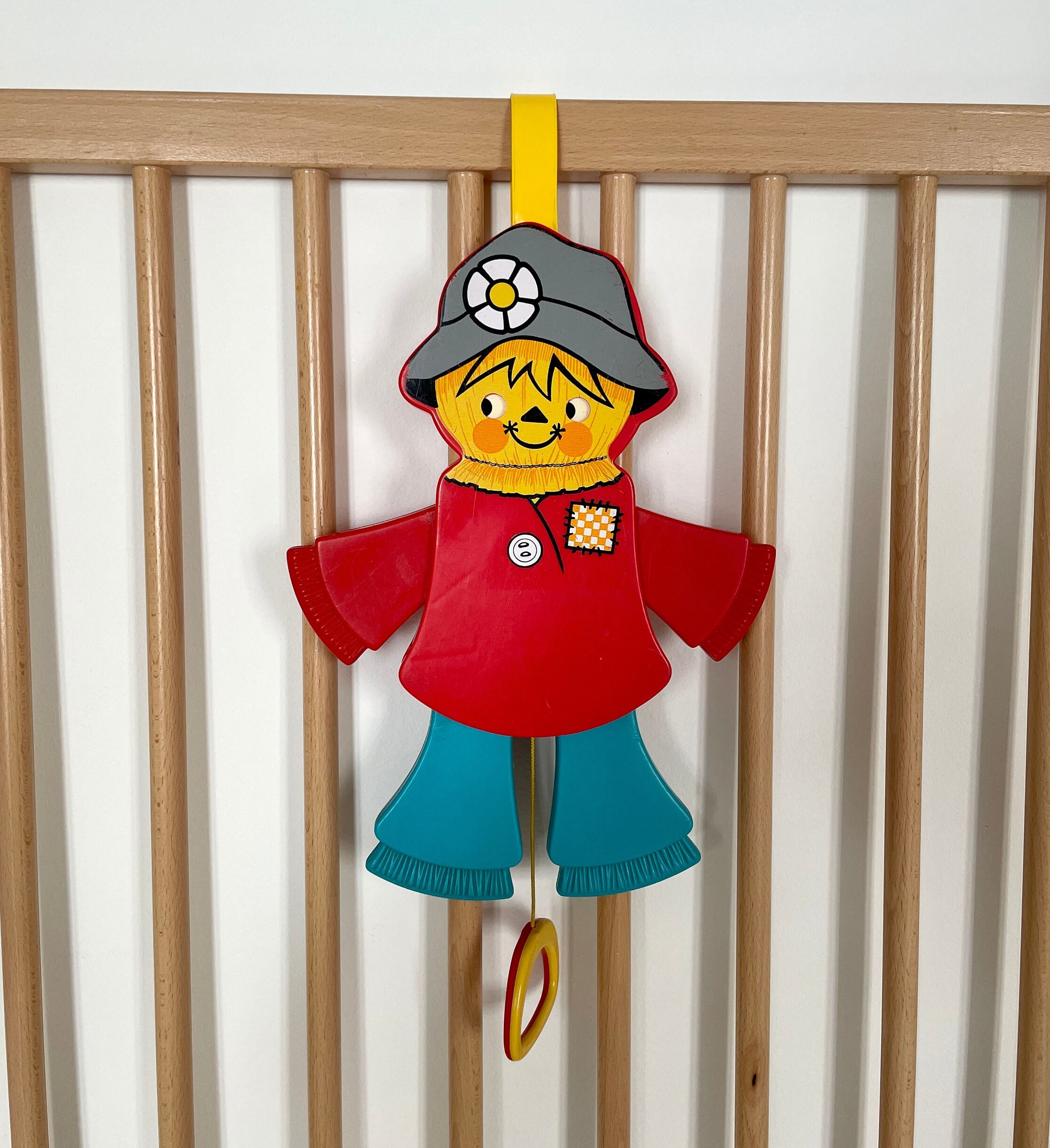 Hier ist die ikonische Bettrassel von Fischer-Preis, die eine lustige Vogelscheuche mit seinem Stroh...