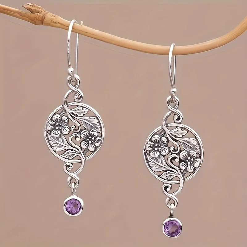 Vintage hohle runde Form Blätter Blume Anhänger lila Amethyst baumeln Ohrringe Boho Stil S...
