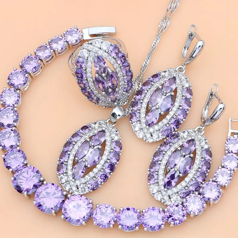 Frauen Silber 925 Schmuck Sets Lila Amethyst Kristall Exquisite Tennis Ohrringe Ringe Mode Halskette...