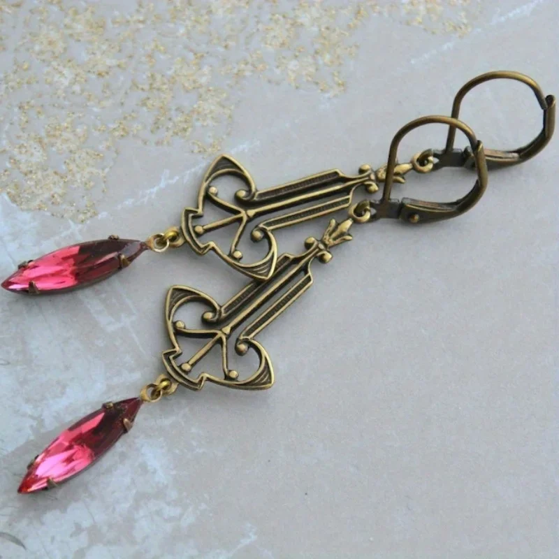 Art-Deco-Jugendstil antike goldene Messing hohle baumeln Haken Ohrringe, rosa Glas Navette Tropfen O...
