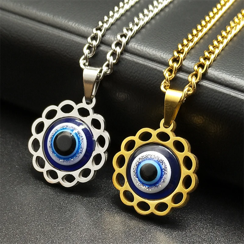 Blume blaue Augen Halskette für Männer Frauen Edelstahl Silber Farbe griechisches Auge lan...