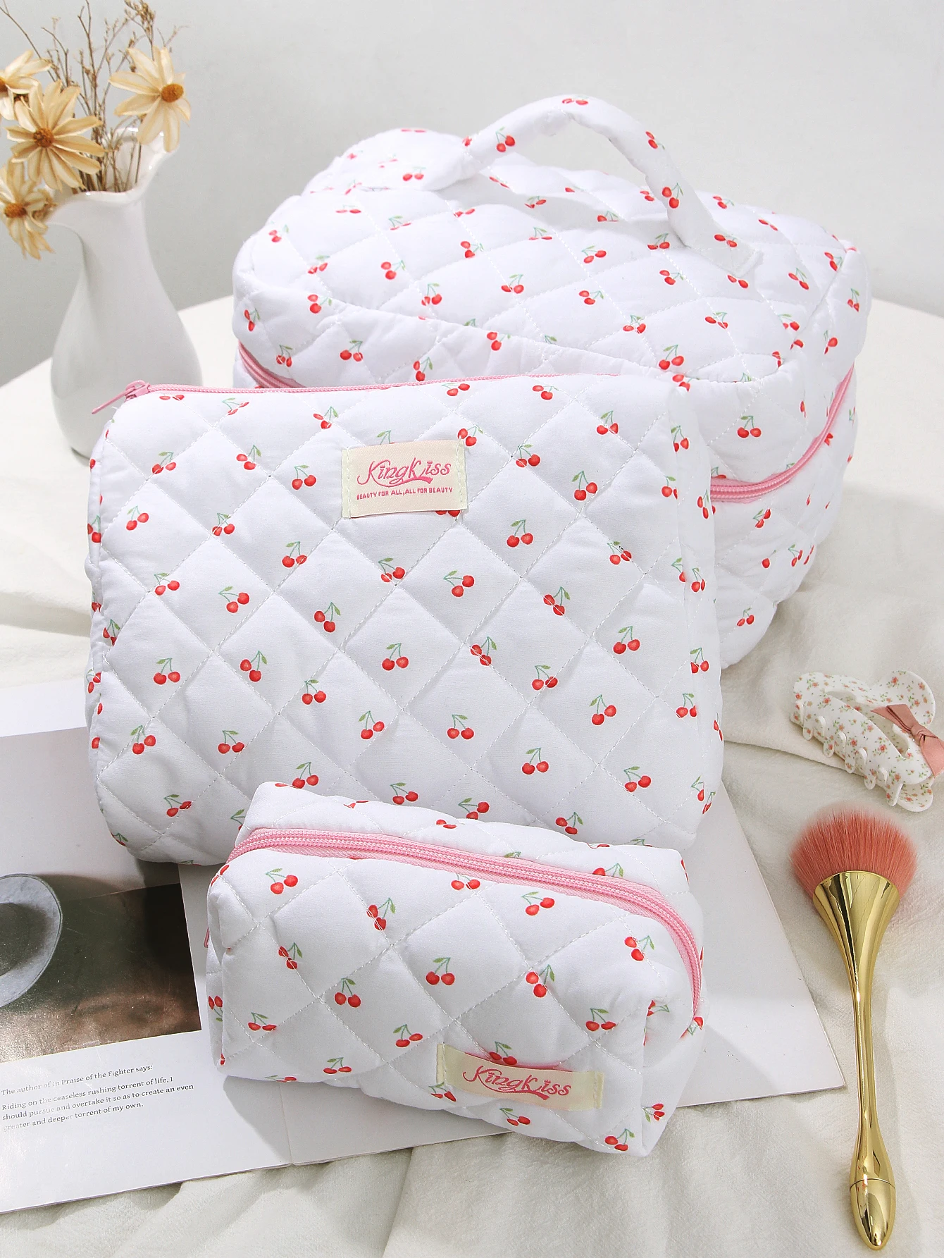 1pc/set White bottom cherry quilted makeup bag,cute aesthetic makeup storage bag, daily toiletries s...