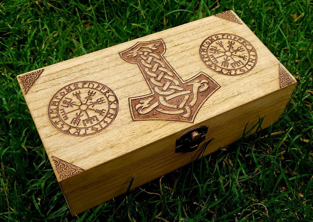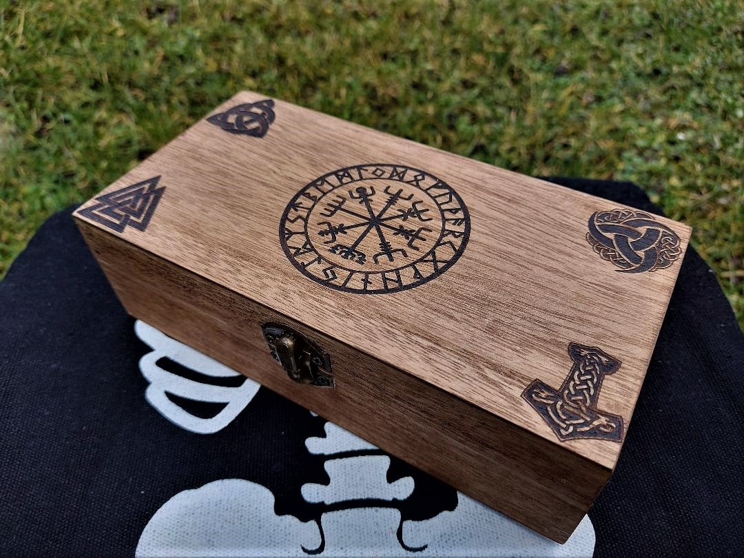 Handgemachte gravierte Holz Schmuckschatulle / Organizer Box Viking...