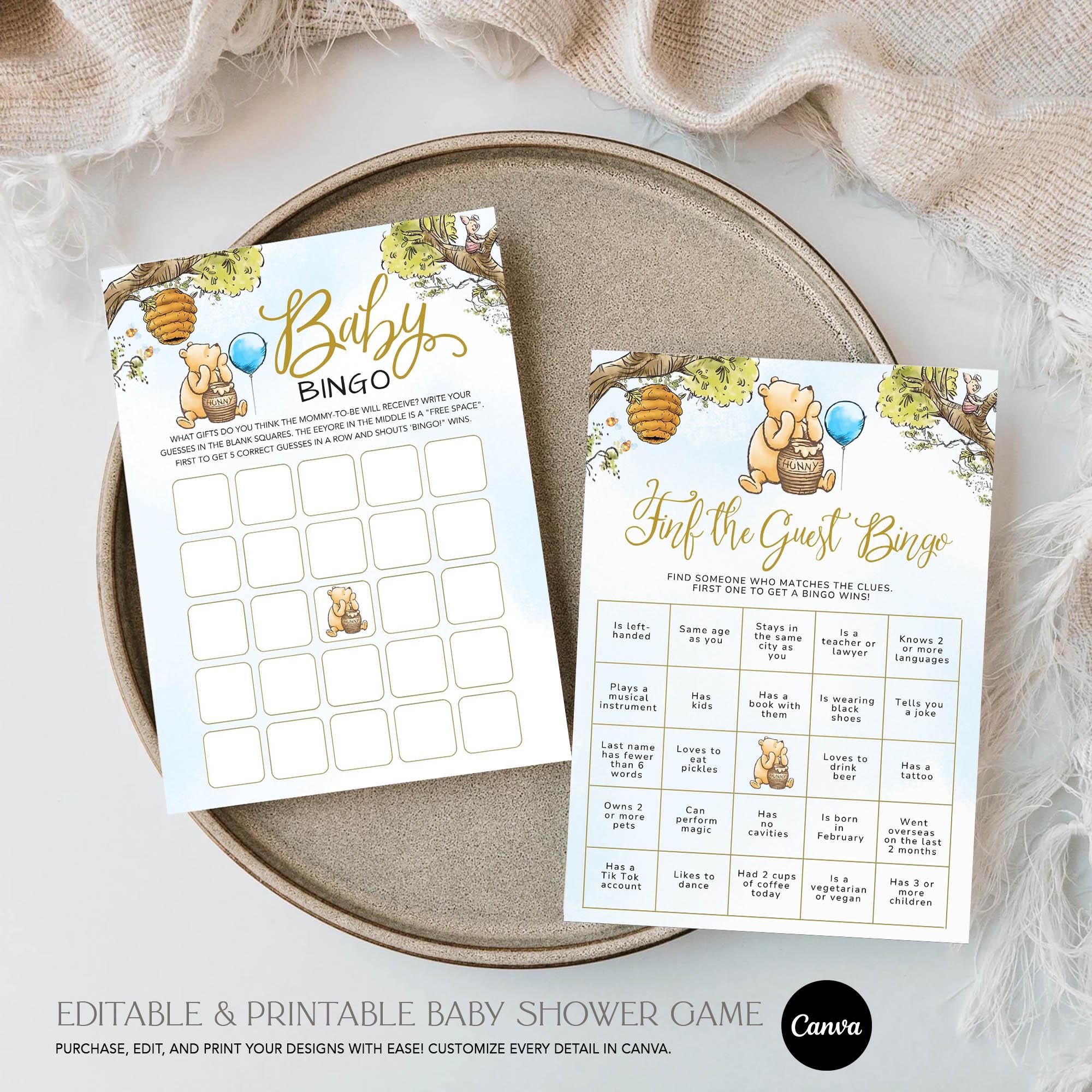 Winnie the Pooh Bingo Spiele Blauer Ballon Bär Bearbeitbar Finden Sie das Gast Pooh Baby Shower...
